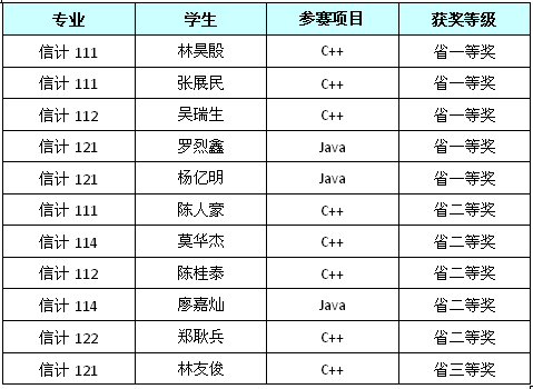 2014年第五届“蓝桥杯”全国软件和信息技术专业人才大赛个人赛省赛获奖结果揭晓,计算科学学院首次共派出2011级和2012级共11名学生参加本次大赛,在王前、吴东庆、杨志伟、侯超钧、胡小健、高川翔、肖爱平等老师的精心指导下,共获得了一等奖5个、二等奖5个、三等奖1个。根据大赛规程,获得省赛区一等奖的5位选手将参加5月底在北京举行的全国总决赛。