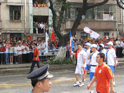 14:00,滨江路两旁仲恺学子已经有序地排在警戒线之外。身穿统一迎接奥运着装,脸上国旗小贴纸,手拿小国旗、奥运五环旗,全副武装的学子们都在静静地等待等待圣火的到来。滨江路珠江边,学子们组成了一道上千米的亮丽风景。