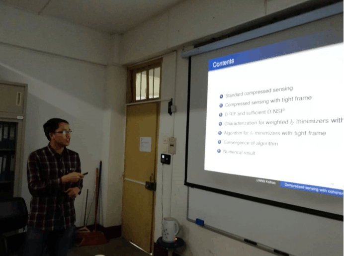 梁凯豪博士做了题为《Compressed sensing with coherent tight frame and application in signals》的报告,分享了一些新的研究成果,以及压缩感知在通信、医学成像、监测上的应用。