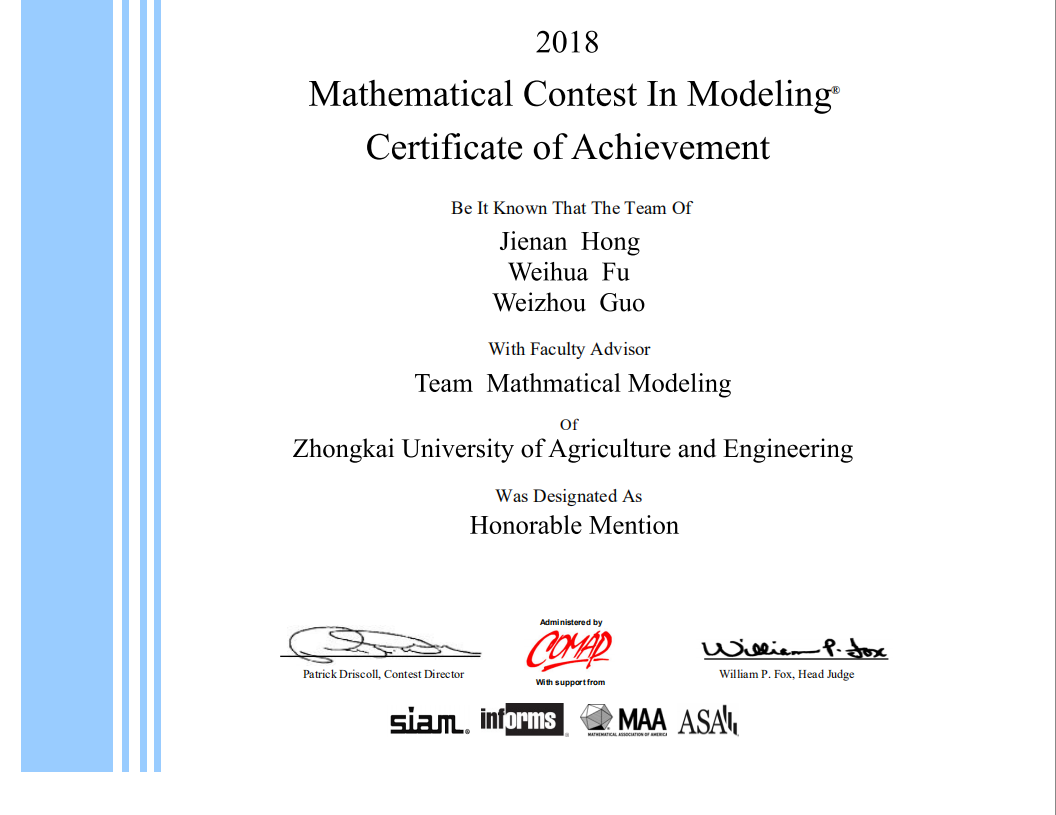 美国(国际)大学生数学建模竞赛(MCM/ICM)由美国数学及应用联合会(COMAP)主办,是世界顶级的数学建模竞赛,享有数学建模“奥林匹克”之称。该项赛事始于1985年,现已成为世界上影响范围最大的大学生学科竞赛之一,大赛每年都吸引来自哈佛大学、麻省理工学院、北京大学等全球各大高校的优秀学生参与角逐。竞赛旨在考查参赛者综合运用数学知识解决实际问题的能力和创新能力,竞争激烈。我校参加学子们在比赛中奋力拼搏,取得佳绩,充分体现了我校学生运用数学和专业知识解决实际问题的实践能力和创新水平。