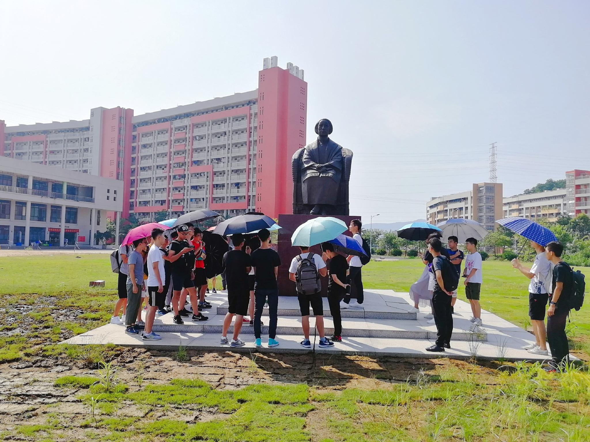 第二站:何香凝铜像,班主任助理为新生们讲解何香凝先生的生平,借此机会增进新生对学校的了解,提升新生对学校的归属感。