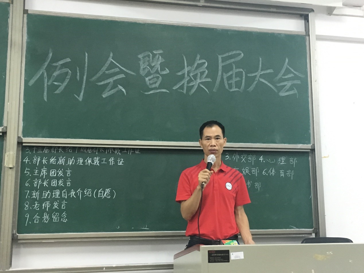 计算科学学院党总支书记刘伟坚致辞。刘伟坚书记为学生干部提出了两点要求:一是做干部要有理想,广大青年学生尤其是学生干部要有明确的理想信念,并不断将其融入学习、生活和工作中,不断提升自己,朝着目标前进;二是做事要有能力,希望各部门的成员能够加强交流,在工作中成长,在成长中学习,提升自己的能力,为组织、为学院做出贡献。此外,刘书记也强调了课堂纪律的重要性,指出各位学生干部要发挥引导作用,严守纪律,并监督带动其他同学,为迎评工作做好准备。