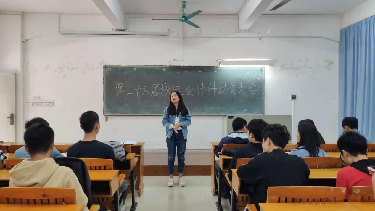 辅导员徐盼详细介绍了此次校运会的相关情况。他号召在场所有运动员们努力拼搏,积极进取,展现我院的青春风采,但也要注意安全。徐老师着重强调了校运会期间保护运动员的安全措施,希望运动员们服从命令、精诚合作,力争取得优异成绩,为我院争光。