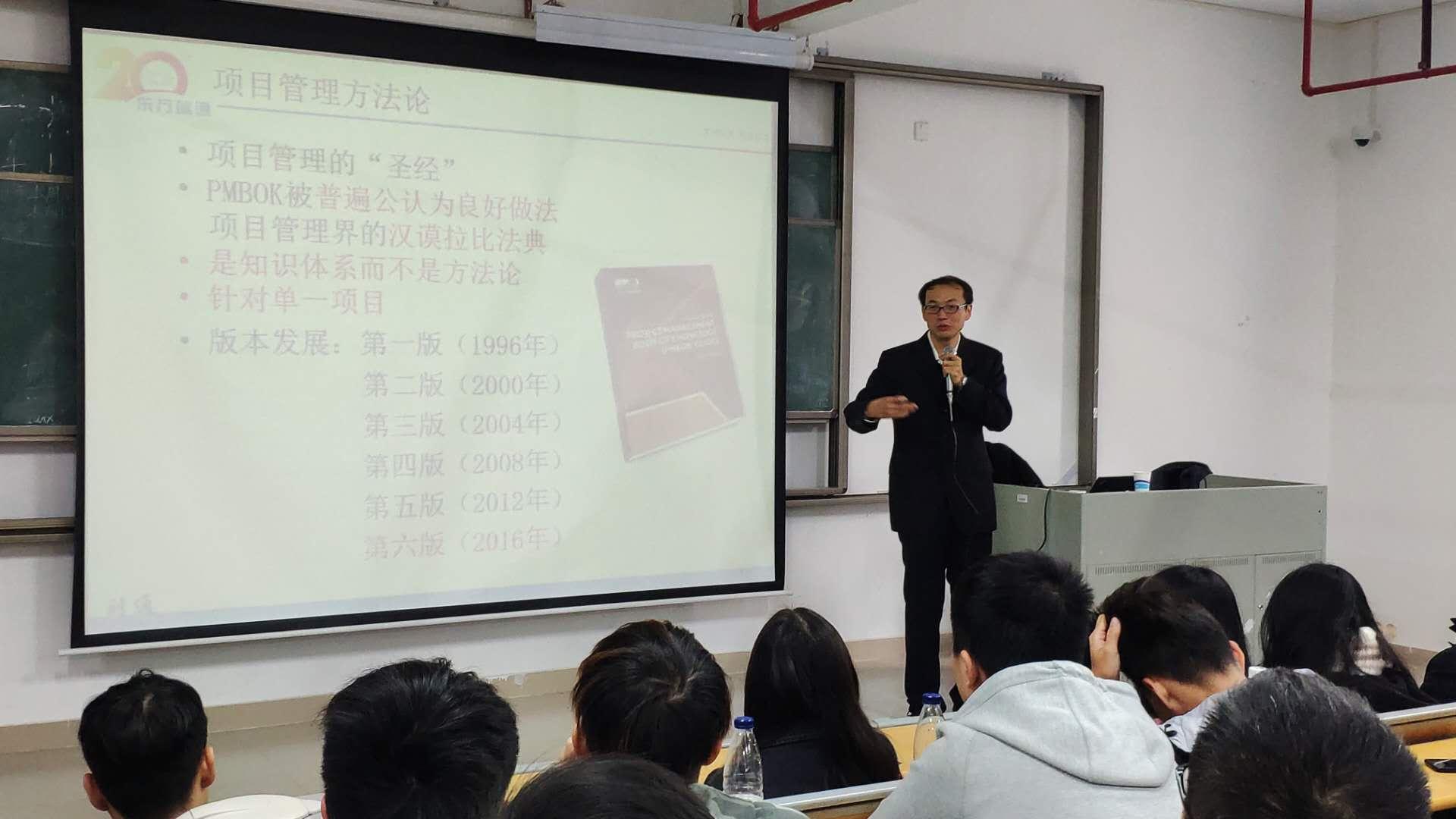 下午1:30,本次讲座开始,王前老师对此次讲座的特邀主讲人做了简单介绍:刘通老师目前是东方瑞通的一名授课老师,在英国爱丁堡龙毕业大学获得硕士学位,主要讲授PMP和ACP项目管理理论及实战、ITIL和DevOps服务管理理论及实战,以及敏捷项目管理和服务管理沙盘指导等课程,他拥有超过20年的IT工作经验,担任过的岗位包括IT服务管理咨询顾问、IT系统架构师等,曾为中国银行、中国移动、广东地税等大型企业做过项目咨询和开发,还将自己做过的案例著书出版,理论和实践经验十分丰富。