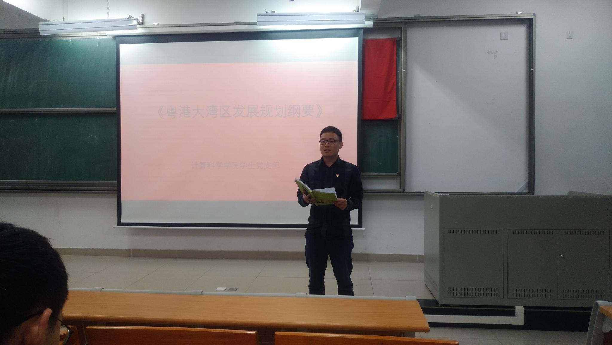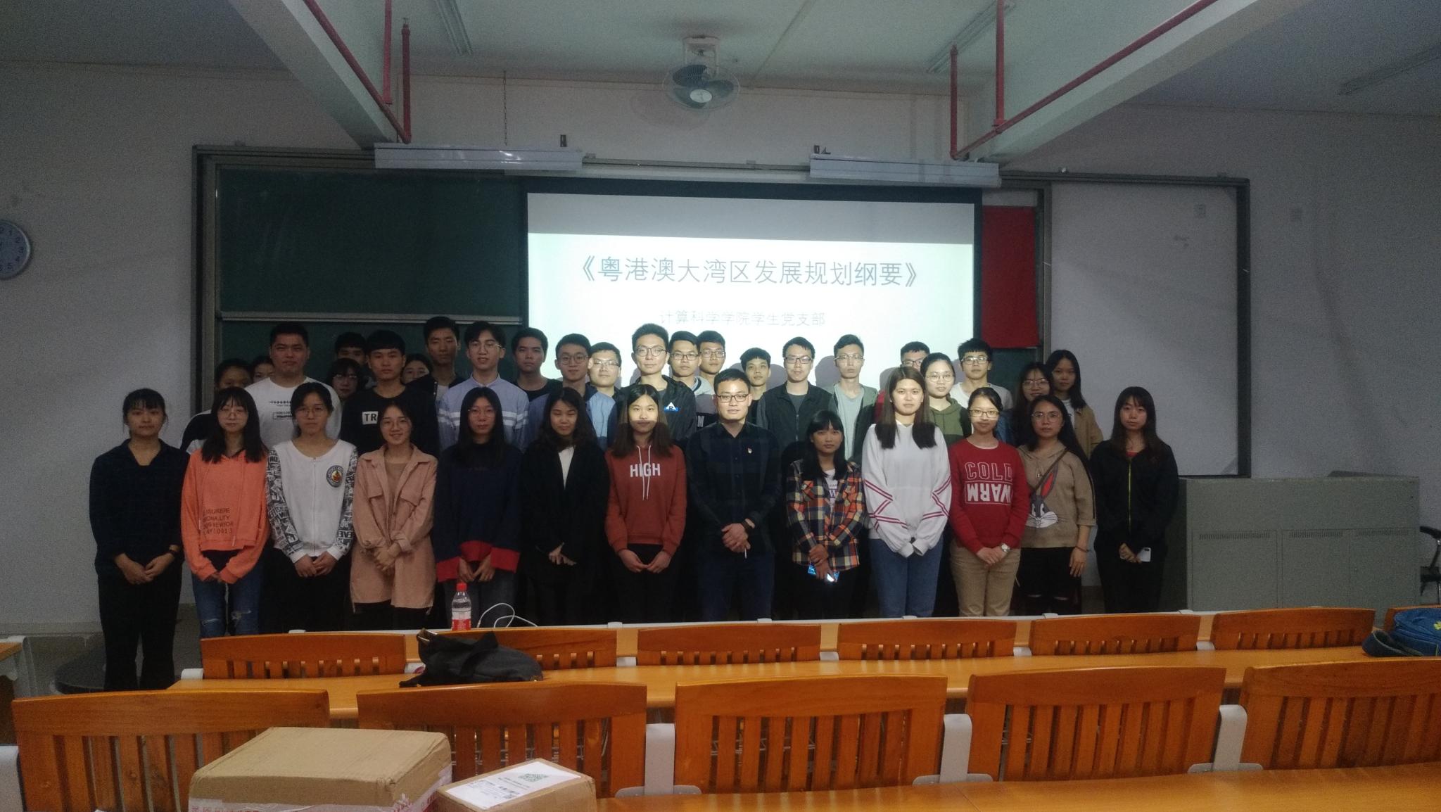 2019年3月3日晚,计算科学学院学生党支部组织党员学习《粤港澳大湾区发展规划纲要》。出席本次学习活动的有计算科学学院信计学生党支部书记徐盼老师,统计专业、信计专业的党员和预备党员。