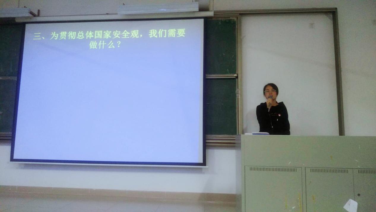 为贯彻总体国家安全观,我们需要做什么呢?辅导员张素雅老师给我们介绍:一是要始终坚持中国共产党的领导,二是要自觉维护国家的政治安全、文化安全、经济安全、网络安全等;三是要传播主流意识形态,坚决抵制不良诱惑;四是要加强国家安全教育,以多种形式开展国家安全教育活动。