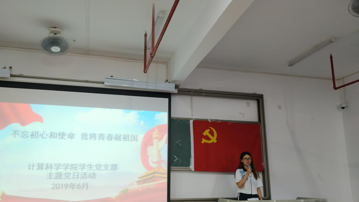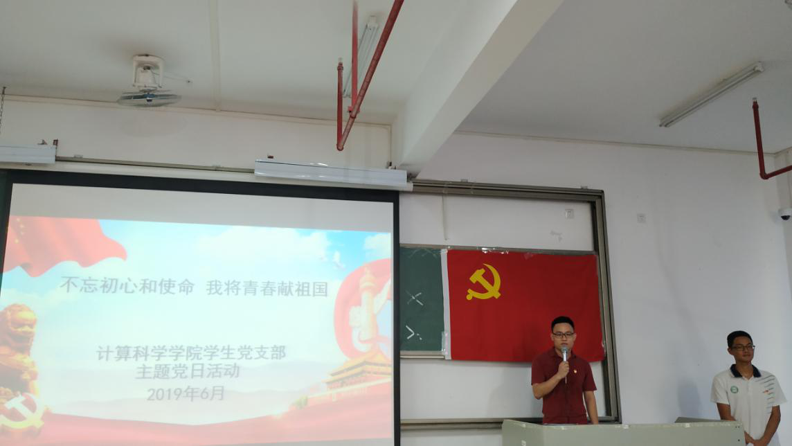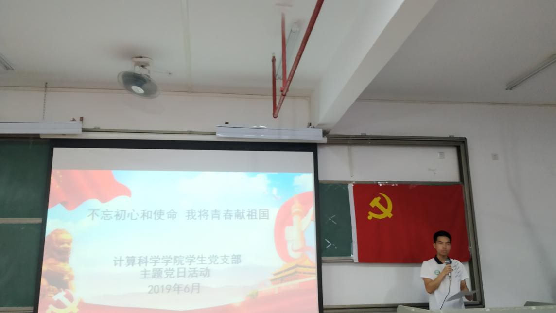 6月28日,计算科学学院学生党支部在D507开展了“不忘初心和使命,我将青春献祖国”的主题党日活动。参加本次活动的人员主要有计算科学学院党总支副书记郭肖明老师、信计党支部书记徐盼老师和统计党支部书记张素雅老师、全体学生党员以及入党积极分子。本次活动由徐盼老师主持。