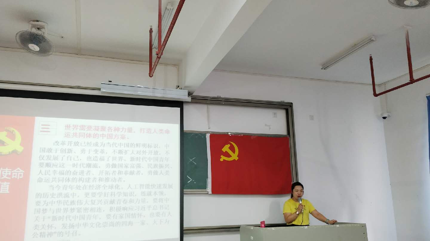郭肖明副书记结合自己在广东省委党校三个月的学习经历和收获感受,给学生党员上了一堂主题为“不忘初心和使命,我将青春献祖国”的党课。郭副书记分享到,自己加入共产党近18年,这18年是她学习历练、干事创业、打牢基础、行稳致远的重要历程。郭副书记围绕着“初心”和“使命”展开党课主要内容,她强调中共党员初心和使命就是为中国人民谋幸福,为中华民族谋复兴。并以习近平总书记在中共中央政治局6月24日集体学习时强调的讲话“千万不能在一片喝彩声、赞扬声中丧失革命精神和斗志”勉励全体与会人员;我们甘于普通却不能甘于平凡,要始终牢记我们的初心和使命,始终把服务集体、人民作为我们党的行动指南。
