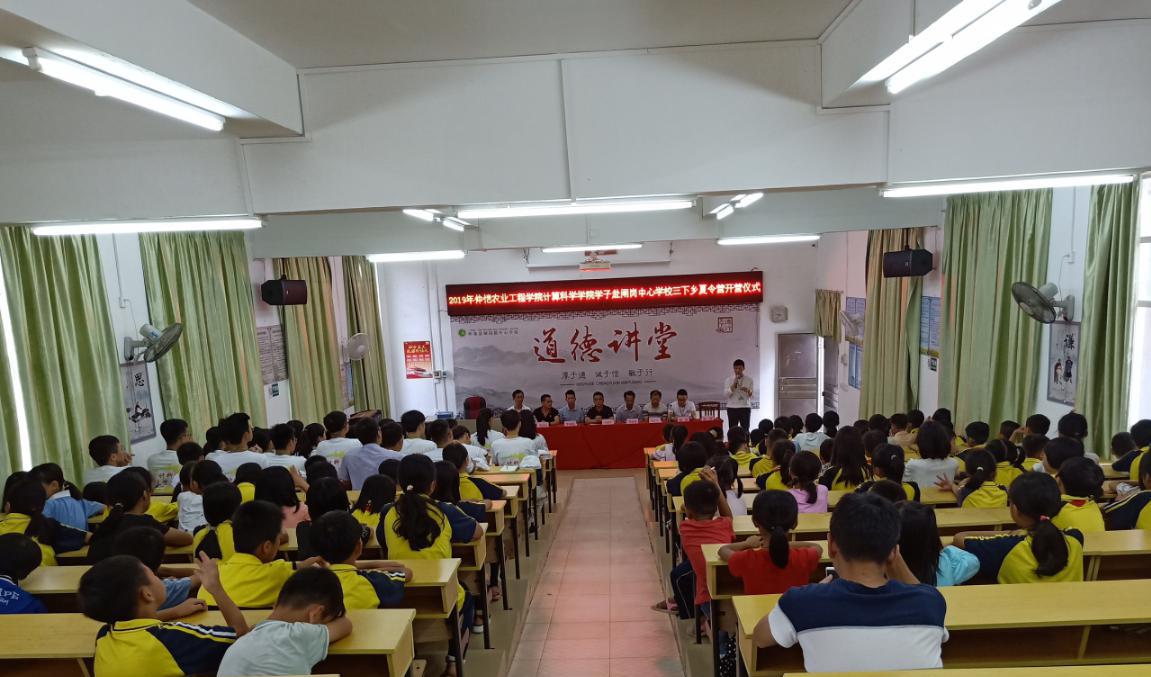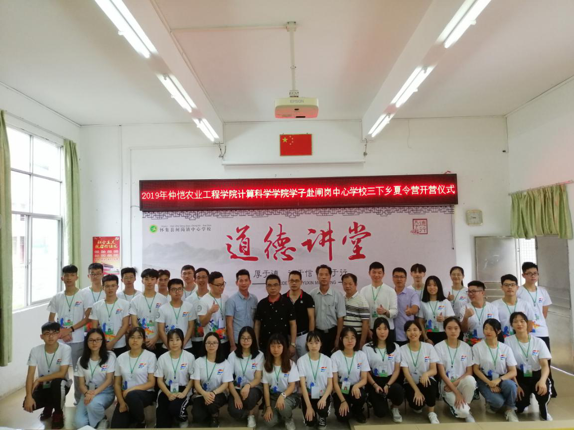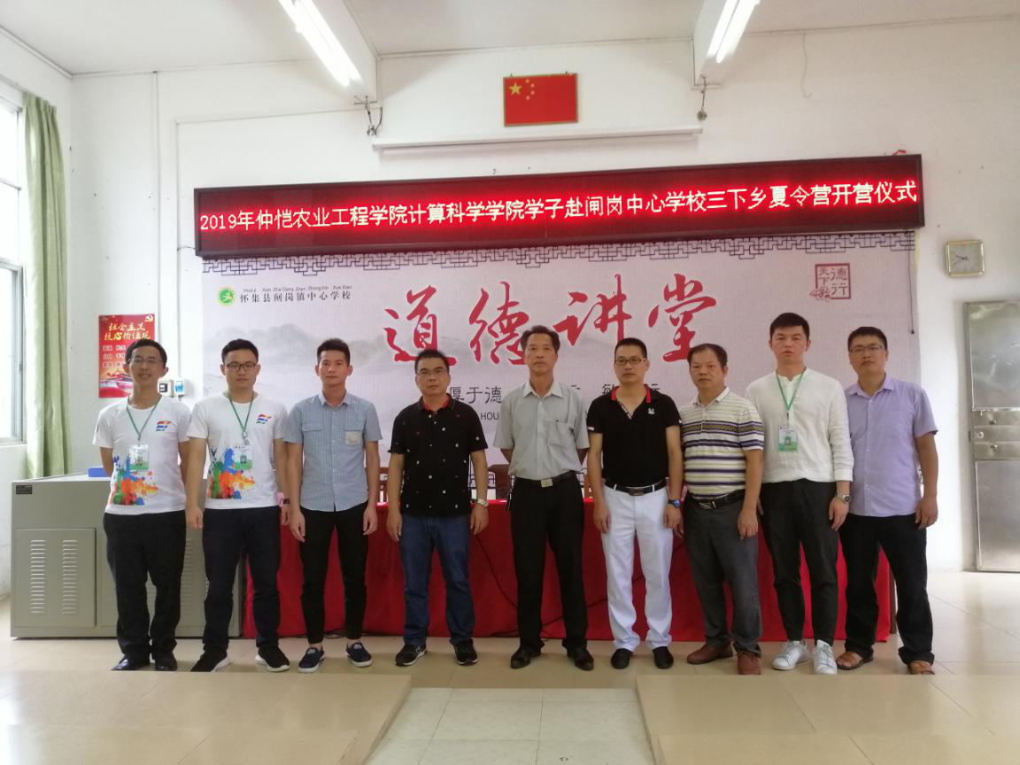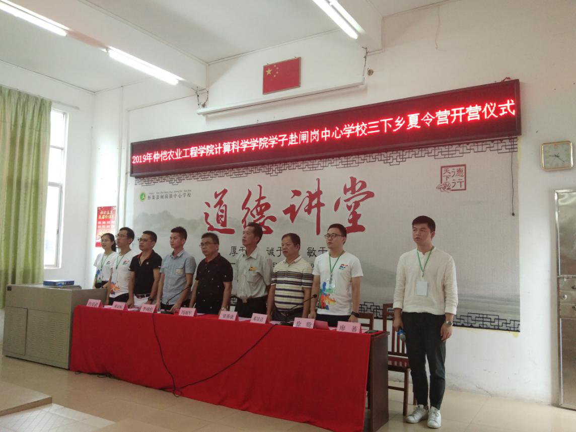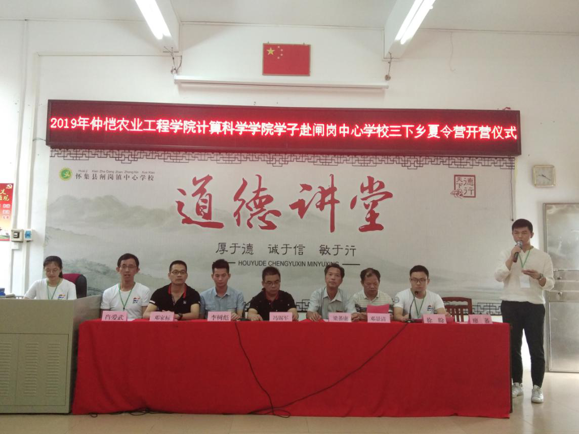 早上9点,召开了仲恺农业工程学院计算科学学院学子赴闸岗中心学校三下乡夏令营开营仪式。出席本次开营仪式的有肇庆市怀集县闸岗中心学校校长冯锡军、副校长梁蕃康、副校长邓家标、闸岗镇团委副书记李树彪、德育主任邓景清、计算科学学院办公室主任肖爱武、院团委副书记徐盼、辅导员廖蕃老师以及计科仲夏梦想队全体队员和参加夏令营的全体闸岗学员。