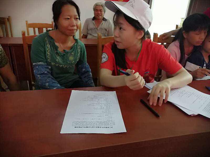 当天上午八点,环宣小分队开始到上步自然村展开环保宣传活动。途中遇到村民,成员们都会热情地与他们打招呼,并邀请村民协助完成调查问卷。有些村民还邀请成员们走进家里,热情地与成员们交流,对村里的一些环保问题表达了自己的看法,成员们也认真地做好记录,并将环保袋和小扇子作为小礼物送给他们。此外,环宣小分队也到大迳村党群服务中心与当地政府工作人员进行沟通,工作人员对我们的行为很是支持并允许我们张贴宣传海报。