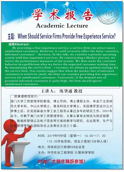 2019年9月9日-练肇通教授学术报告-主题: When Should Service Firms Provide Free Experience Service?
