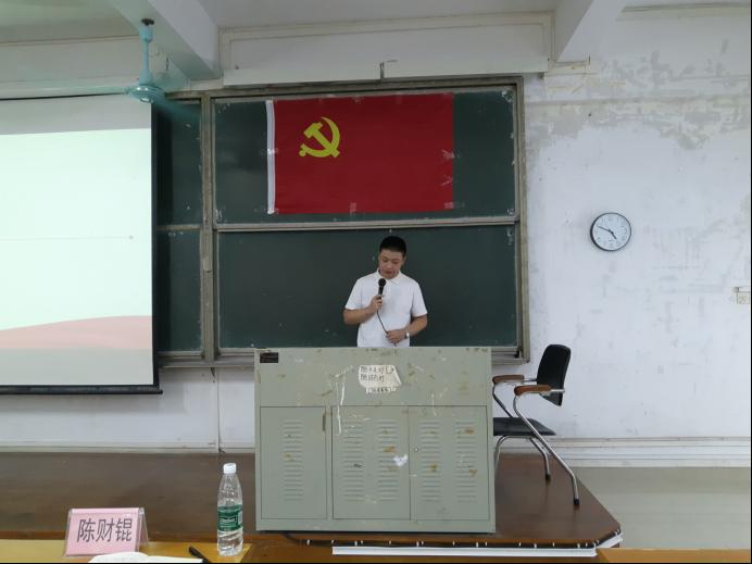 随后,陈财锟同学以“不忘初心跟党走”为主题分享了自己向党组织靠拢的初心和努力过程。他讲述了中国的历史发展进程,揭示了祖国是如何一步步从一个饱受侵略的国家发展到如今世界第二大经济体的地位。“清如水,心有树,勤读书,猛如虎”,陈财锟同学作为青年一代的代表,深知“少年强则中国强”的深刻意义,鼓励师弟师妹要有远大的理想抱负,努力成长为能肩负起时代重任的共产主义接班人。