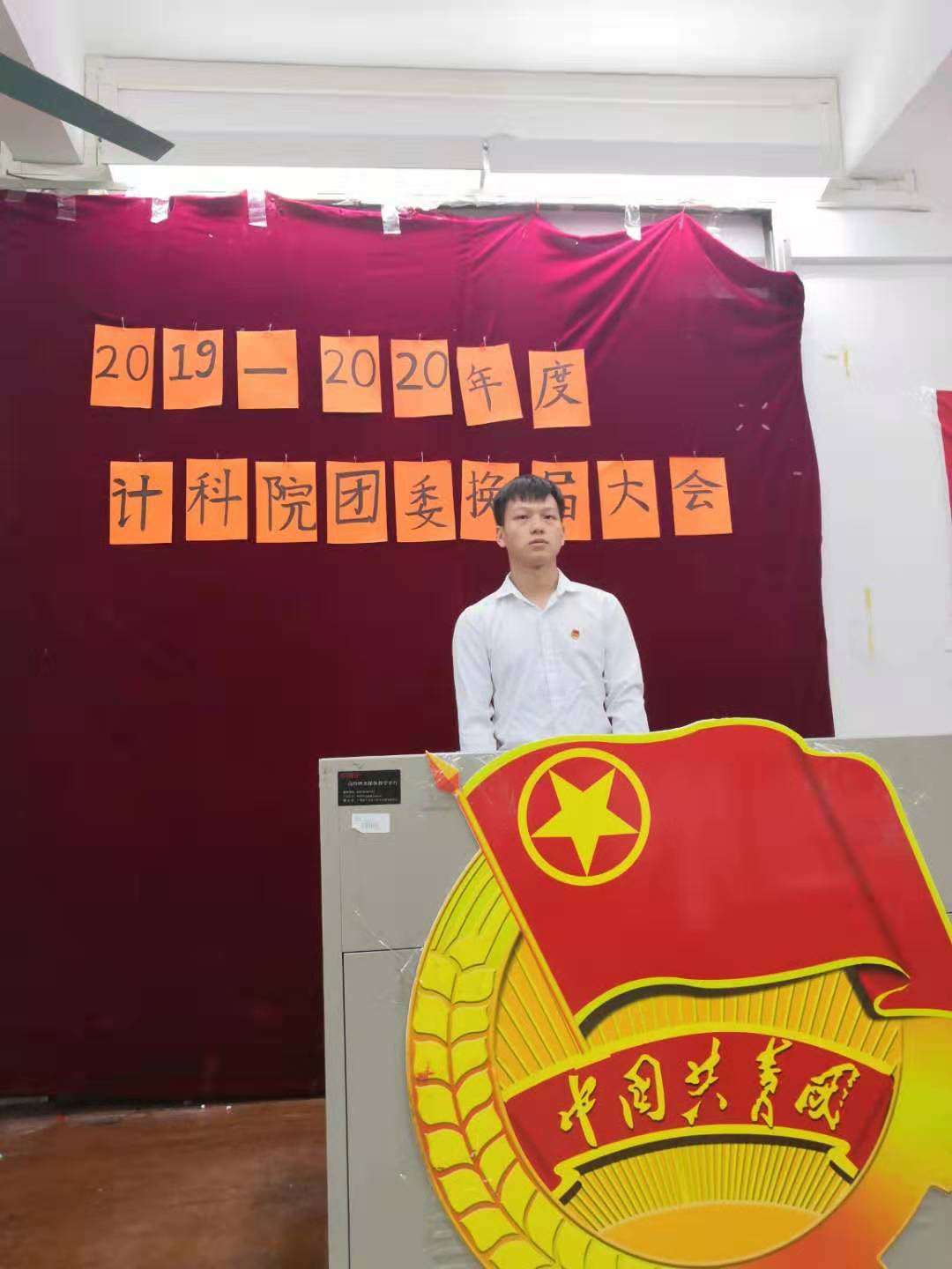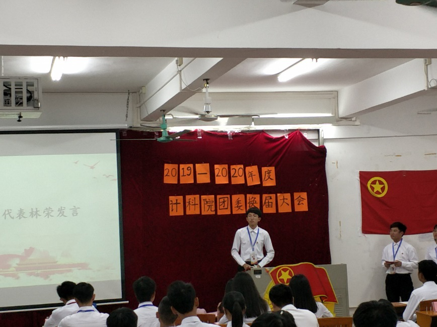 2019届计算科学学院团委书记团代表林荣同学发言。林荣同学提出了几点要求:一是做好院团委的本职工作,积极发挥团干的模范带头作用;二是做到团结和谐,部门之间、干事之前要加强沟通,互帮互助,相互友爱;三是做好思想建设工作,加强思想层面的引领,增强院团委的辐射带动作用。