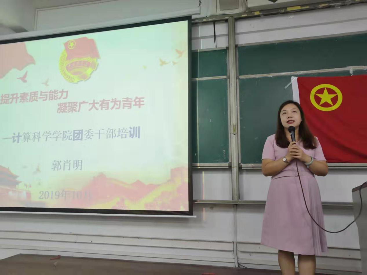 会议尾声,计算科学学院党总支副书记郭肖明总结发言并进行了团干培训。郭肖明对全体团干的时间观念、此次会议的现场布置等表示肯定和赞扬,强调了团干及院团委的重要性,共青团员作为党的后备军,要不断提升素质与能力,积极向党组织靠拢。