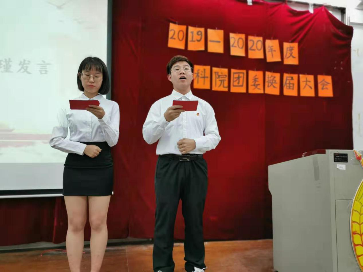 会议开始,全体起立,奏唱团歌。2018届书记团代表刘晓瑾同学上台进行述职报告,对上一年度的工作情况进行总结,表示在新的学年里,院团委要更加注重工作上的细节,提升创新能力,加强思想引领。