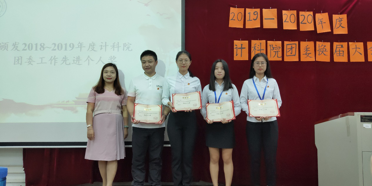 计算科学学院党总支副书记郭肖明为团干颁发2018~2019学年度团委工作先进个人奖,鼓励全体团干向榜样学习,积极发挥自己的才能,为院团委的发展做贡献。