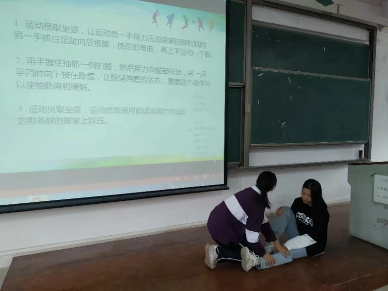 林华萍同学和邓燕同学为运动员进行了赛前培训,强调运动会要调整好心态,赛前适当保持训练强度并做好热身准备,防止运动拉伤。随后,两位同学讲解了关于比赛场上处理应急情况的技巧,并进行了详细示范。