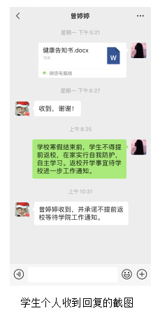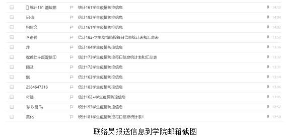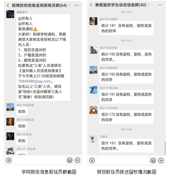 学院学生干部队伍中设有信息管理监测联络工作机制,该工作机制内的信息管理及监测联络细分至每个“学生宿舍”为基础单位,形成辅导员老师~年级联络员~班级联络员~宿舍联络员管控队伍。管理监测联络员有专门工作微信群,专门接收防控疫情工作的信息和汇报数据。