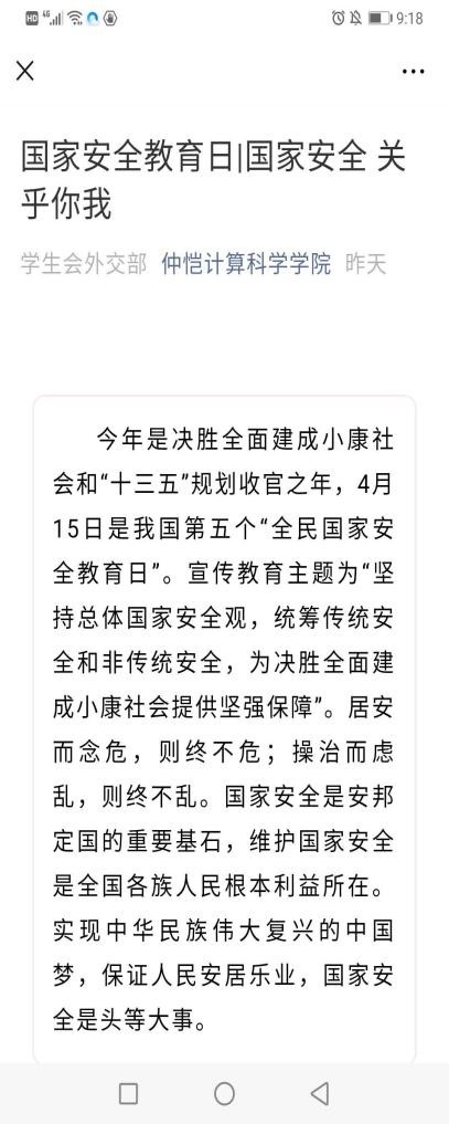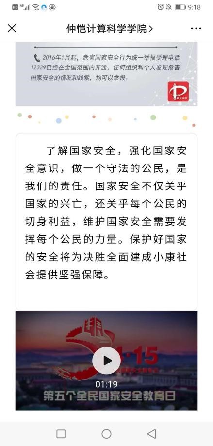 2020年4月15日是我国第五个“全民国家安全教育日”。为贯彻落实习近平总书记重要指示精神,做好我校国家安全教育工作,进一步增强学生维护国家安全的意识和能力,4月15日,计算科学学院组织全体师生观看“国家安全”教育短片,传播国家安全知识,提高我院师生的安全责任意识。