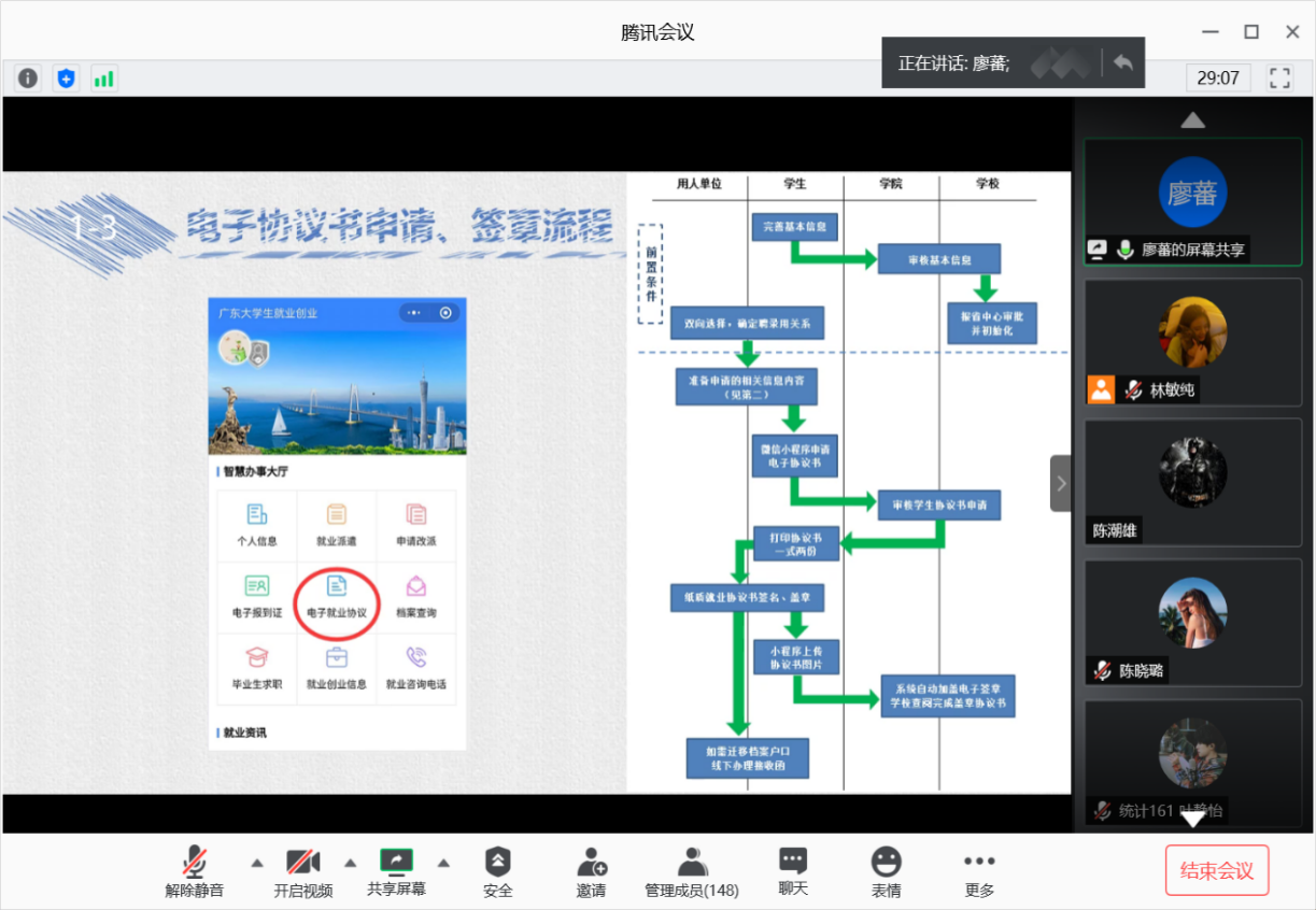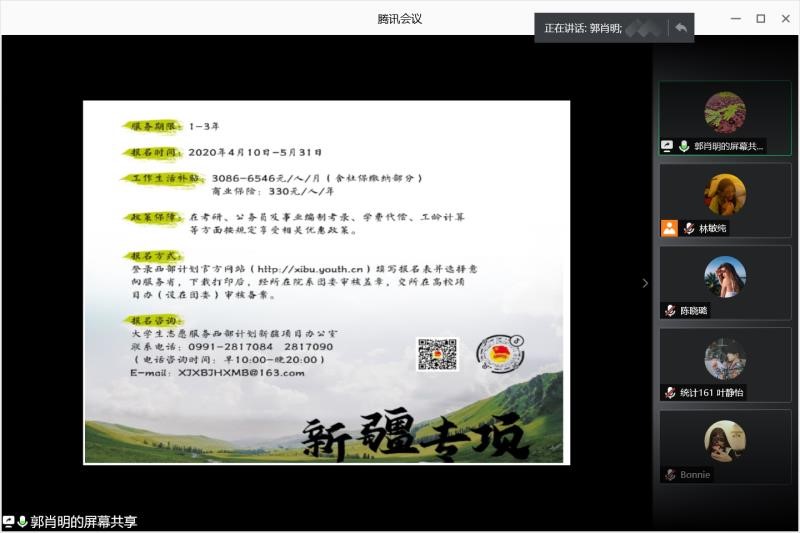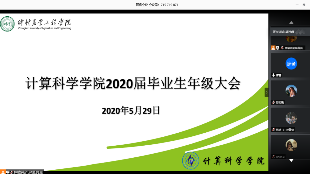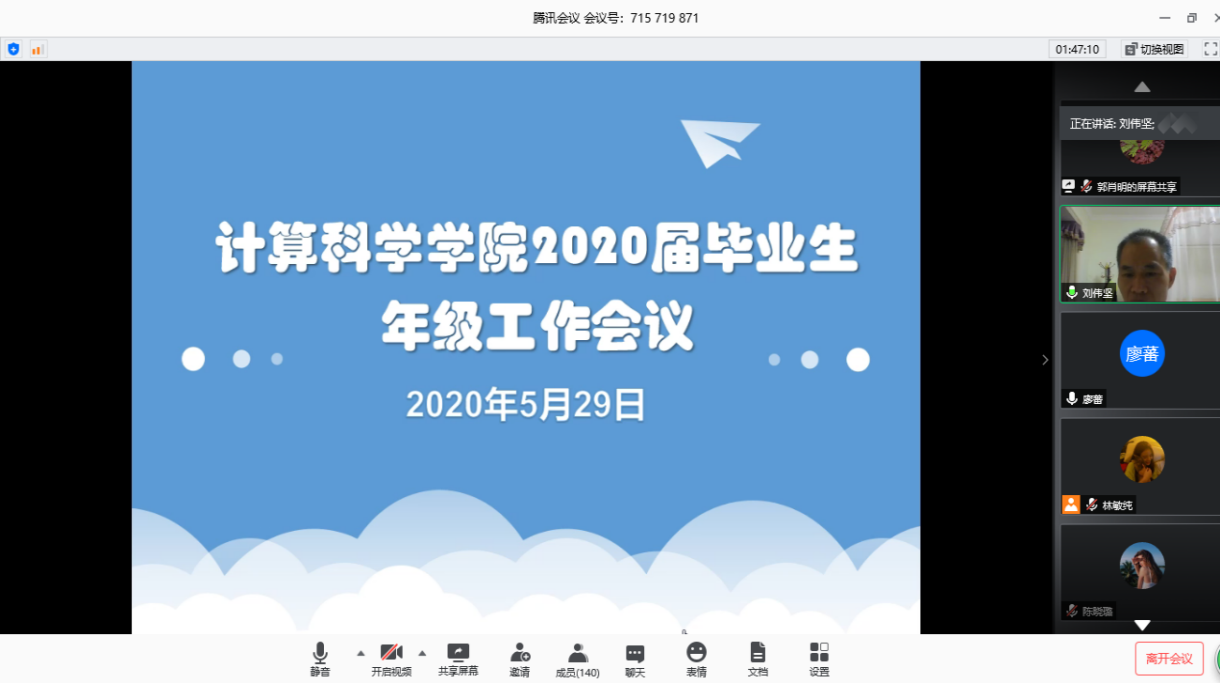 为做好2020年我院毕业生就业工作,保障毕业生顺利、安全、文明离校。5月29日,计算科学学院通过腾讯会议网络平台召开2020届毕业生年级大会,出席本次大会的有学院党总支书记刘伟坚、党总支副书记郭肖明、辅导员廖蕃、毕业班班主任代表肖爱平、李聘环、郑晓玲老师以及2020届全体毕业生。