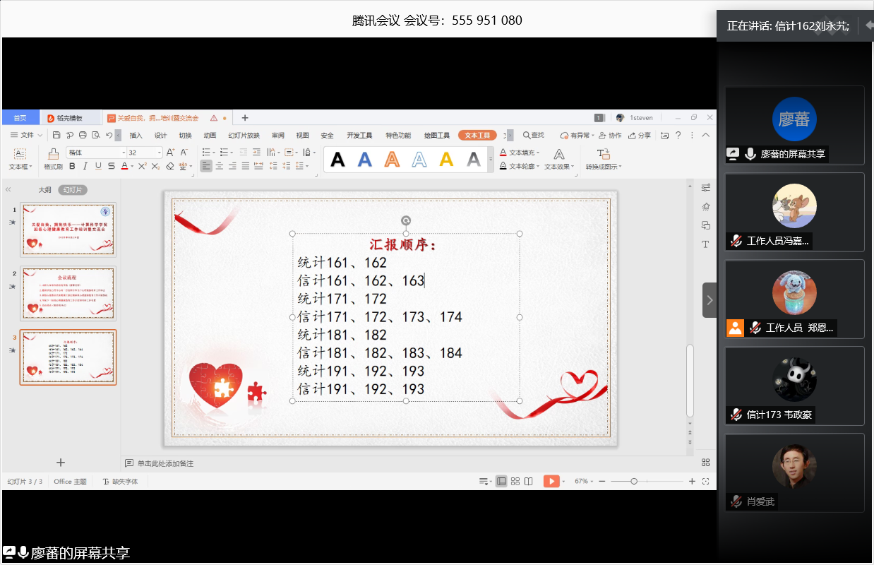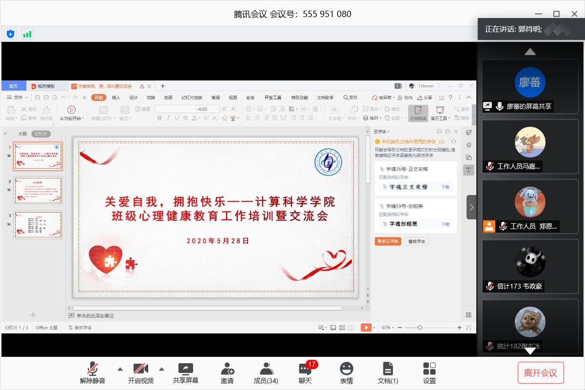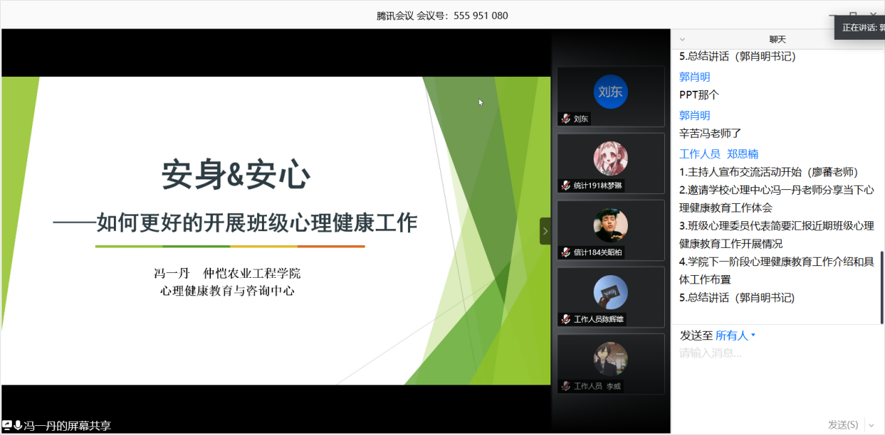 为关注学生心理健康,帮助学生解决情绪问题,在学生中营造学习、普及、宣传心理健康知识的良好氛围,提高疫情防控期间大学生心理健康工作的针对性,响应学校心理健康月的活动。计算科学学院通过腾讯会议召开了心理委员心理健康教育培训与交流会。本次会议由辅导员廖蕃主持,学院党总支副书记郭肖明、学校心理中心冯一丹老师,以及学院各年级班主任出席会议。