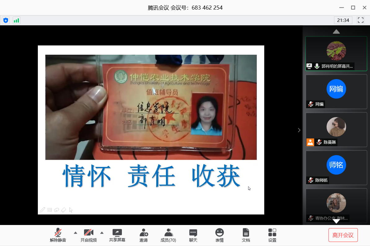 人生须知负责任的苦,才能知道尽责任的乐。郭书记给我们分享了她的工作方式和方法,每项工作井井有条,各类工作都总结了要做什么,要怎么做,条理分明。郭书记还提及到他带出来的学生干部,无一不是优秀的人,并以此鼓励我们继续充当学生干部,做好当下,有所传承。“火车跑得快,全靠车头带”郭书记讲到,作为学生干部的我们,要相信自己能做得更好,在工作中不断进步,让工作更高效,顶住困难,守住学生工作的基础,带好新人,共克时艰。并提到未来将加强团建和干部培训。