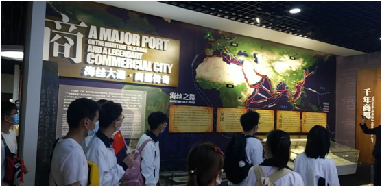紧跟着讲解员的步伐,师生党员依次参观了序厅、综合展区、专题展区、互动展区4大分区。在汉白玉石墙上刻有中山纪念堂、五羊雕像等代表广州市的传统建筑,也有广州塔、广州国际金融中心等现代标志性建筑。广州市地方志馆天花板上展现了158种不同字体的“羊”字,代表着古老的羊城广州以千姿百态来迎接八方来客。随后,师生党员参观了广州之最,领悟这座千年老城散发的独特魅力。广州,作为一座千年商都,早在秦汉时期,就形成了一条由南中国海到印度洋的海上丝绸之路。同样,广州也是一座红色城市,著名的广州起义、黄花岗起义皆发动于这座英雄的城市,是民主革命的策源地。广彩、粤剧、陈李济乌鸡白凤丸制造工艺等一系列独具广州特色的文化,吸引着师生们的目光。