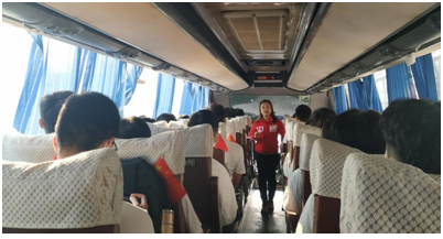 出发路上,全体成员齐唱红色歌曲,《我和我的祖国》、《我的中国心》等系列爱国歌曲一路随行。学院党总支副书记郭肖明带领大家合唱《我的未来不是梦》。伴随着同学们手里飘扬的红旗和嘹亮的歌声,郭肖明表达了对同学们的殷切希望和美好祝愿,“你们是清晨八九点钟的太阳,未来是我们的,更是你们的。”这更加坚定了同学们一心向学,为国效力的决心。