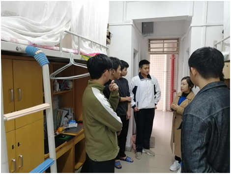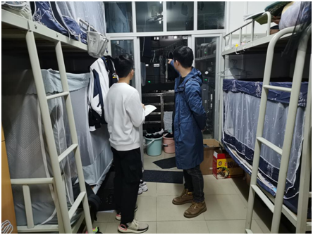 辅导员张素雅和廖蕃带领学生党员检查宿舍,并认真做好记录,强调要杜绝向学生社区楼外倒水、投掷物品、吐痰等不文明行为,爱护好、保护好宿舍的桌椅、床铺、花洒等硬件设施,提醒学生对存在高空坠物安全隐患的地方进行整改。