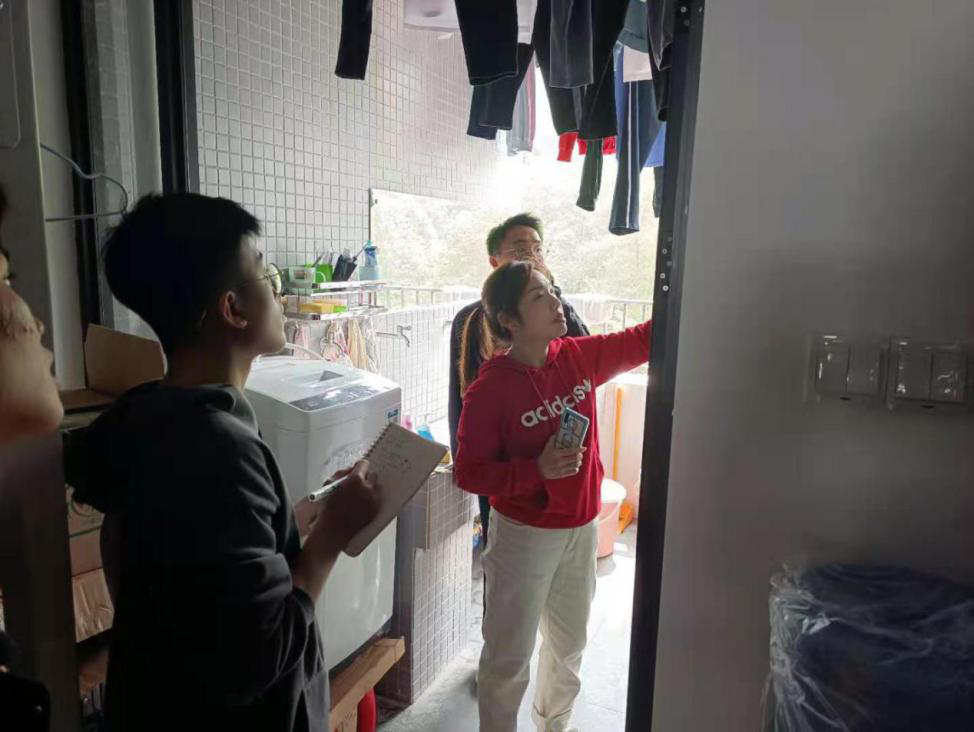 此次走访学生社区发现,学生精神面貌良好,宿舍均较为整洁,但个别宿舍仍存在垃圾堆放、物品多且摆放凌乱、乱张贴等问题。郭肖明指出要充分利用空间、借助收纳工具进行整理、在阳台玻璃门上贴“防撞”的荧光标志等,舍友要互相互助,相亲相爱,共同营造积极向上、和谐温馨的宿舍氛围。