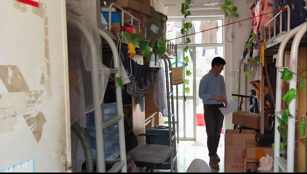 张素雅、廖蕃、吕依驰逐一对学生社区进行安全隐患排查,仔细检查每间宿舍的电器使用情况,并认真做好记录。学工老师指出个别宿舍存在垃圾堆放、物品摆放不整齐、地面不干净等问题,要立即整改,建立宿舍轮值制度,保持宿舍干净卫生、通风明亮,不要在阳台处挂放杂物、绿植等,避免高空坠物。