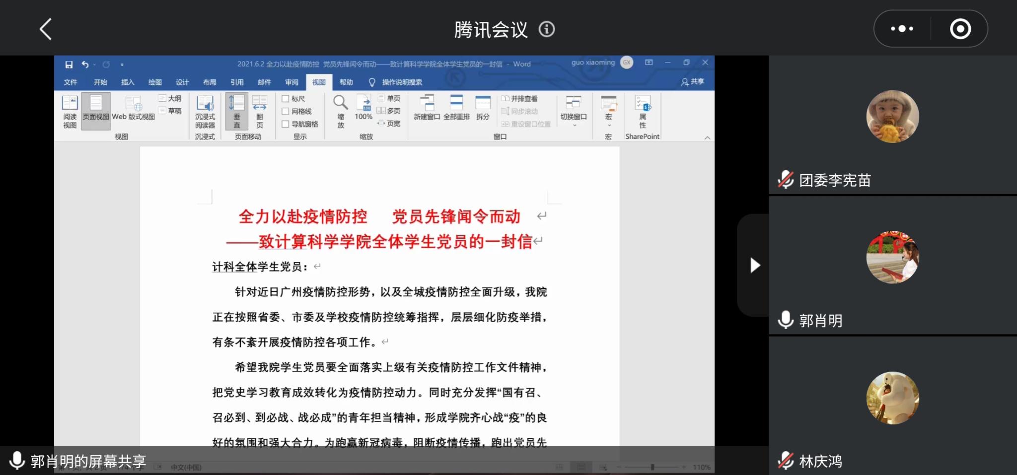 于6月2日晚19:00在线上召开,本次会议的参与成员包括学院党总支副书记郭肖明、辅导员张素雅、廖蕃和吕依驰,辅导员助理、学生党支部负责人、院团委书记团、院学生会主席团、院青协会长团、军事教导大队、助班组长团。