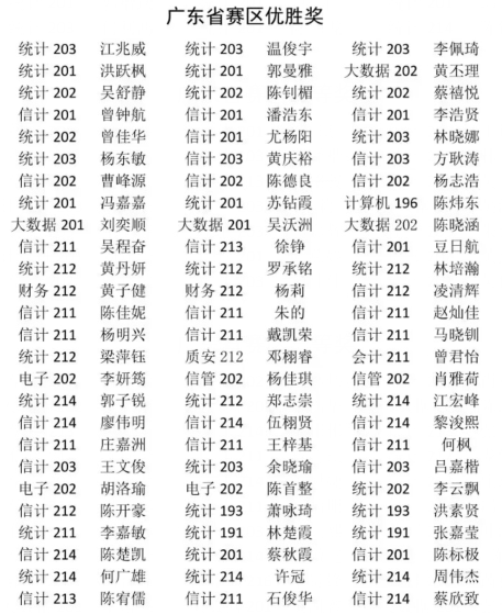 经过校内数学建模竞赛选拔赛等层层考验,今年我校选拔了303名同学组队代表学校参赛。暑期课程培训、专业讲座再加上数模指导团队悉心指导为竞赛获奖奠定了扎实的基础。经过三天三夜的不懈努力,我校101支参赛队按时、高质量地完成了参赛作品并最终斩获佳绩,并荣获广东省赛区一等奖2项、二等奖7项,三等奖11项,优胜奖26项。
