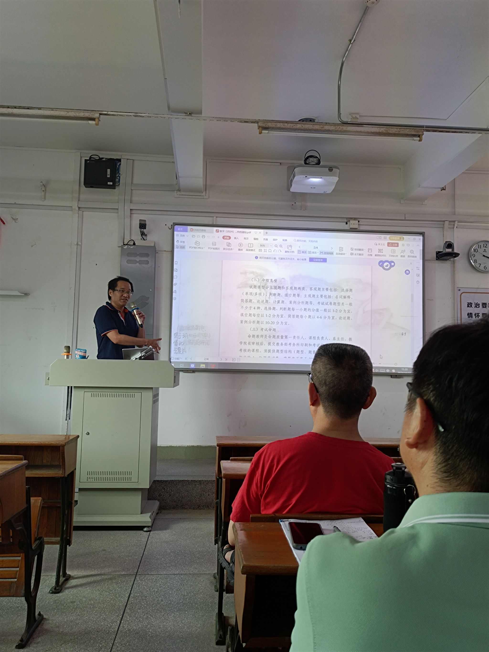 参会老师集体观摩党员教师严鸿鸣的高等数学课堂。严鸿鸣以其丰富的教学经验,为大家展示了一堂内容精彩的高等数学课。参会老师纷纷表示,通过观摩学习,近距离感受教学经验丰富的老师教学风采,学到许多实用的教学方法和技巧。在教师座谈交流会环节,由数学系主任黄业辉主持。黄业辉带领老师们一起学习学校《关于规范本科课程期末考核试卷工作的通知》,并详细讲解期末考卷出题、评卷和存档等方面的具体要求。学院教工第一党支部书记徐应祥介绍了数学虚拟教研室的建设工作进展情况。他指出,虚拟教研室的建设是教育教学改革的重要一环,不仅有助于教师间的交流学习,还能推动公共数学课的智慧教学。虚拟教研室的建设框架是根据OBE教育理念进行搭建的,旨在实现教学目标与学生学习成果的紧密对接。徐应祥还展示了虚拟教研室的主要框架和功能,分享了智慧教学在数学教学工作中的应用案例,如利用虚拟教研室生成不同难度梯度的试卷等。徐应祥还强调了虚拟教研室在深化“新农科”建设、切合“四新”学科建设需要方面的重要作用,鼓励全体党员教师积极参与虚拟教研室的建设工作,共同探索数学教学的新模式、新方法。