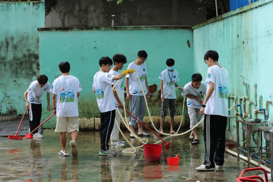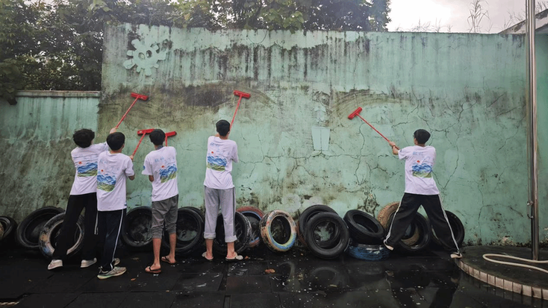 青年突击队员主动帮忙刷洗幼儿园运动场墙壁。虽然清理工作难度大,但队员们不怕脏、不怕累。经过一番努力,原本脏乱的墙壁焕然一新,运动场也变得更加整洁美观。