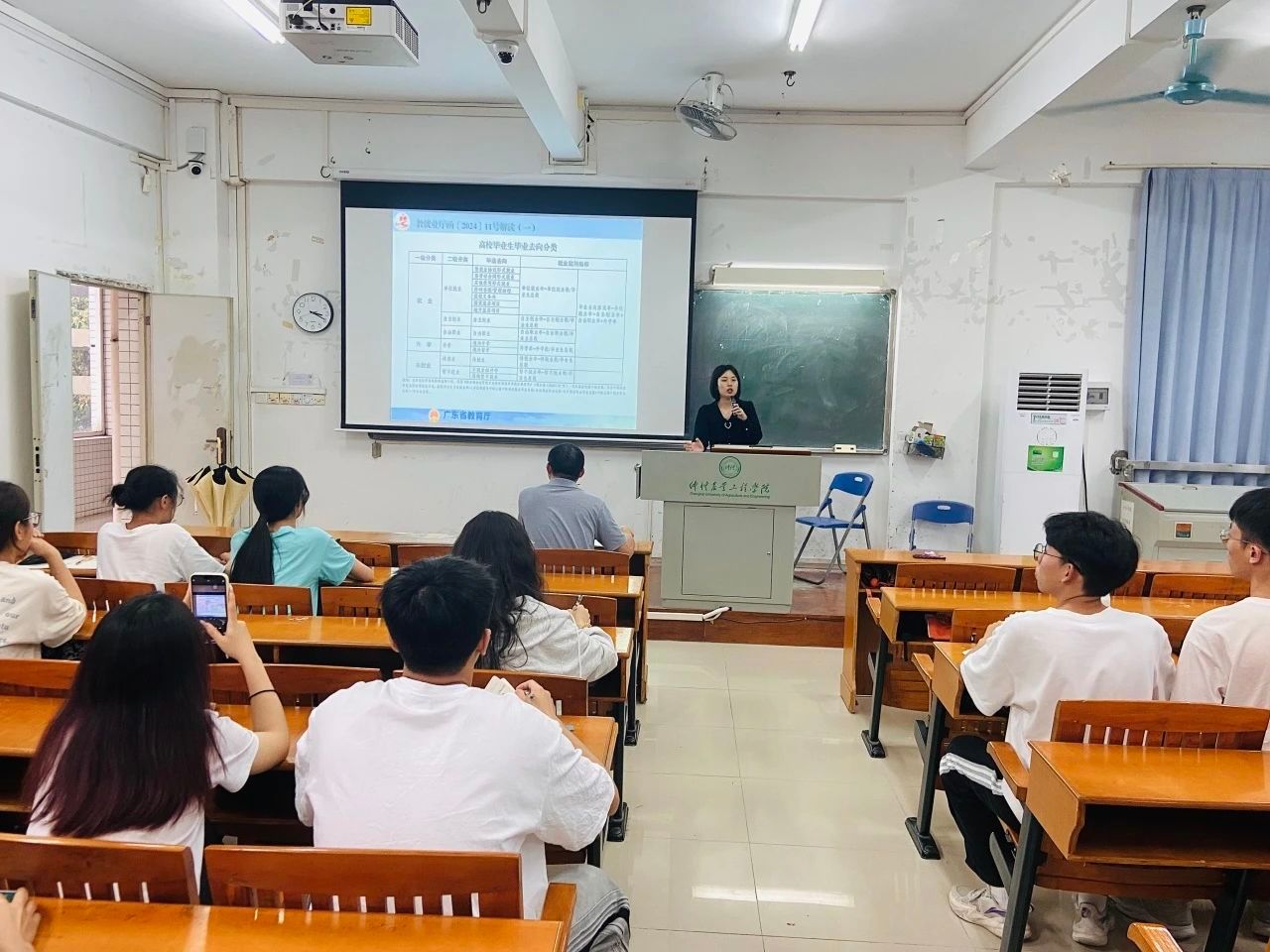 吕依驰介绍了就业服务队的主要工作内容,部署2024届毕业照拍摄、毕业生礼物、就业信息填报、档案整理等工作,详细介绍了在广东大学生就业创业小程序上填报就业信息的流程,对签就业协议形式就业、签劳动合同形式就业、其他录用形式就业、科研助理/管理助理、应征义务兵、国家基层项目、地方基层项目等就业指标填写细则进行讲解。