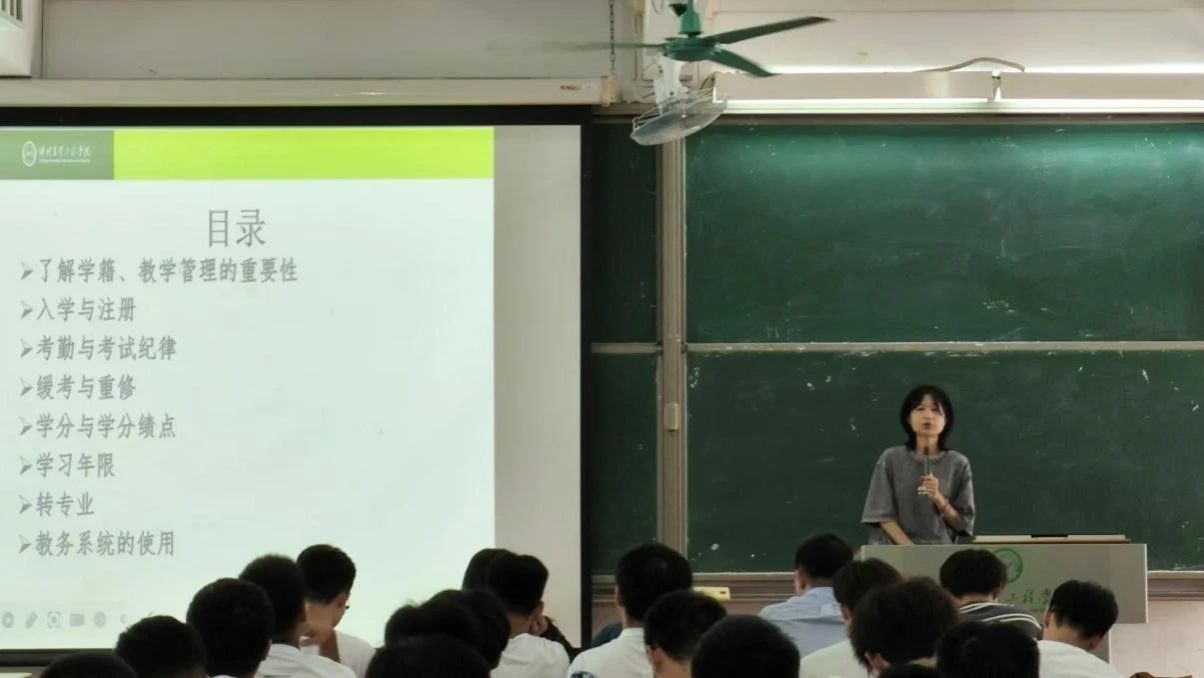 教务员罗赟老师为新生详细讲解了《仲恺农业工程学院本科生学生手册 2024版》 教学管理的模块,包括学籍管理规定、课程考核管理规定、创新实践学分实施细则以及教务系统操作等内容。强调了考勤考纪的重要性,新生要严于律己,主动学习,不断提升自己的专业素养和综合能力。