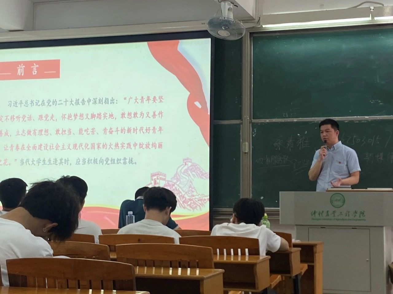 辅导员廖蕃老师和解廷鑫老师分别为新生介绍了学院的党团组织建设情况,入党、入团的条件和程序,鼓励新生们积极向党组织、团组织靠拢。廖蕃以“生而逢盛世,青年当有为”为主题,围绕党的历史、基本理论和路线方针政策等方面进行了深入浅出的讲解,引导新生树立正确的世界观、人生观和价值观。他强调,作为新时代的大学生,要坚定理想信念,增强“四个自信”,为实现中华民族伟大复兴的中国梦贡献青春力量。