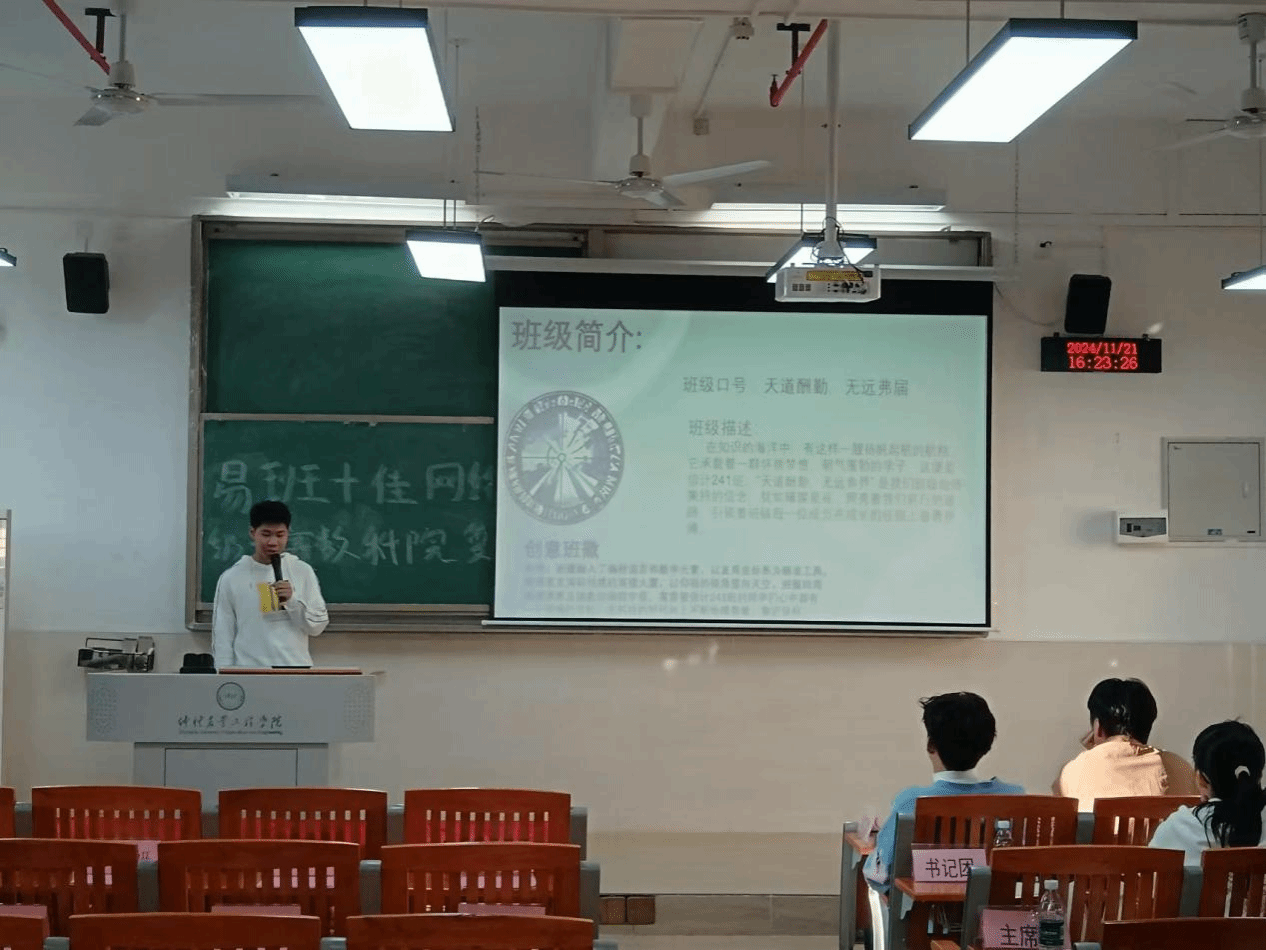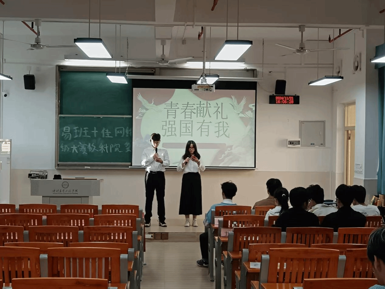 11月21日下午,3044am永利集团官网在经管楼210室举办“青春献礼,强国有我”易班十佳网络班级大赛复赛。学院辅导员解廷鑫、校易班学生工作站代表林剑涛、团学组织代表以及2024级各班委共同参与本次活动。