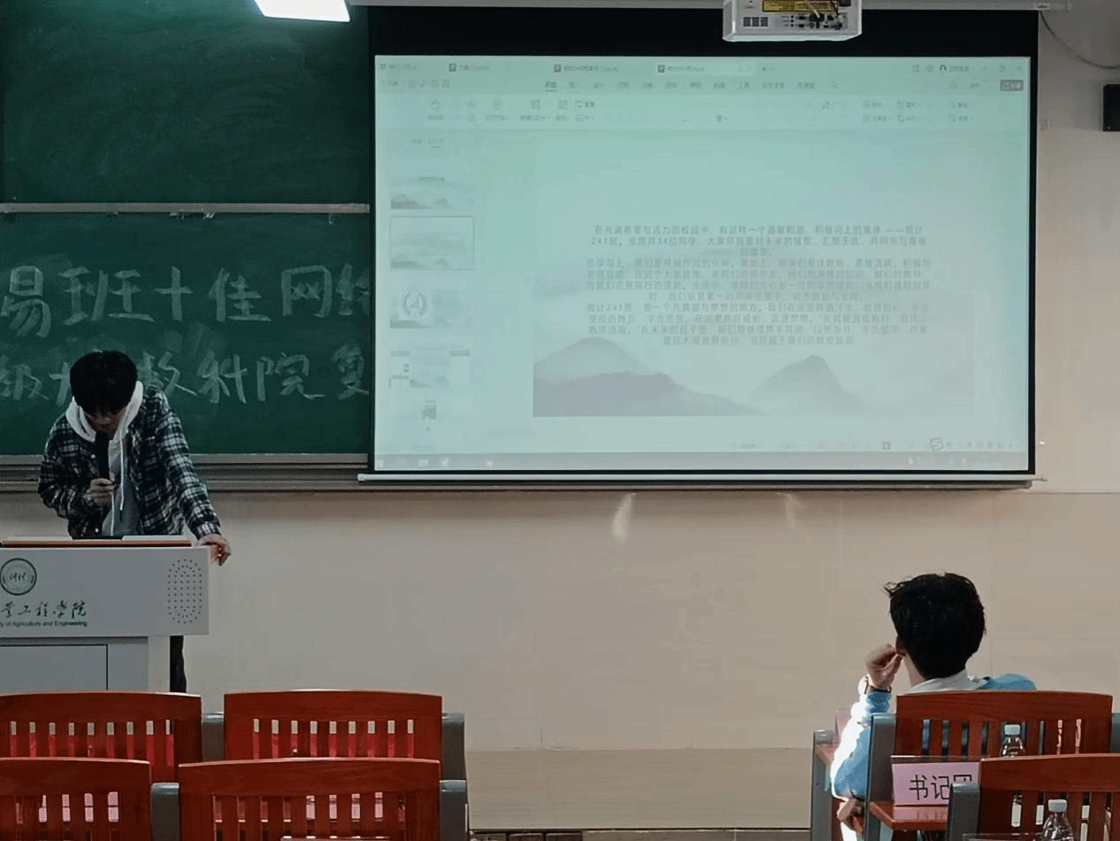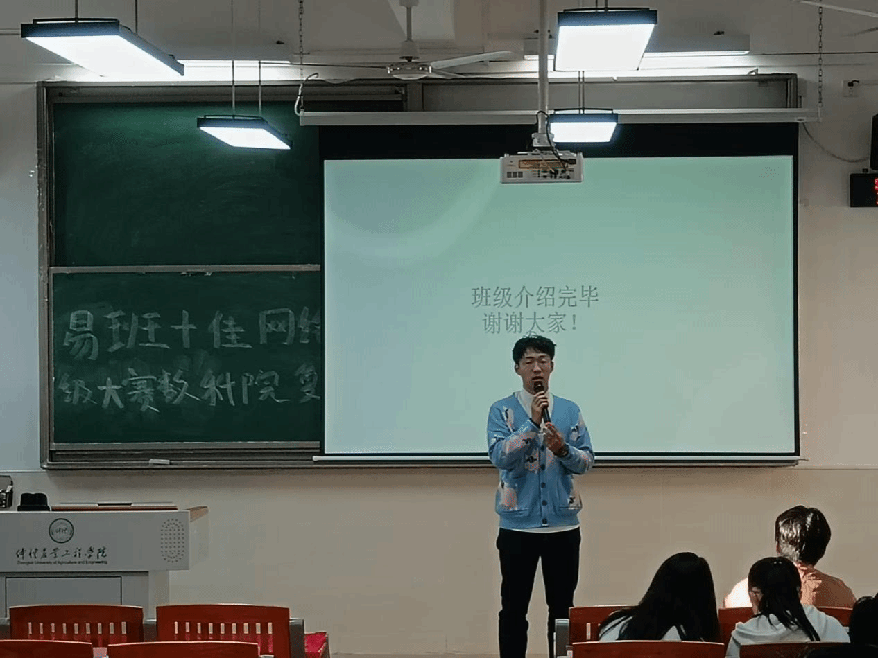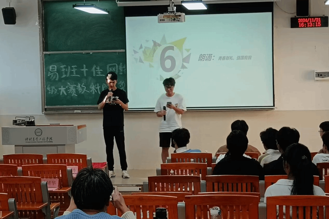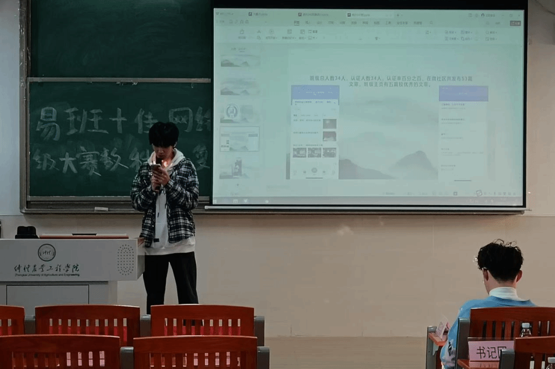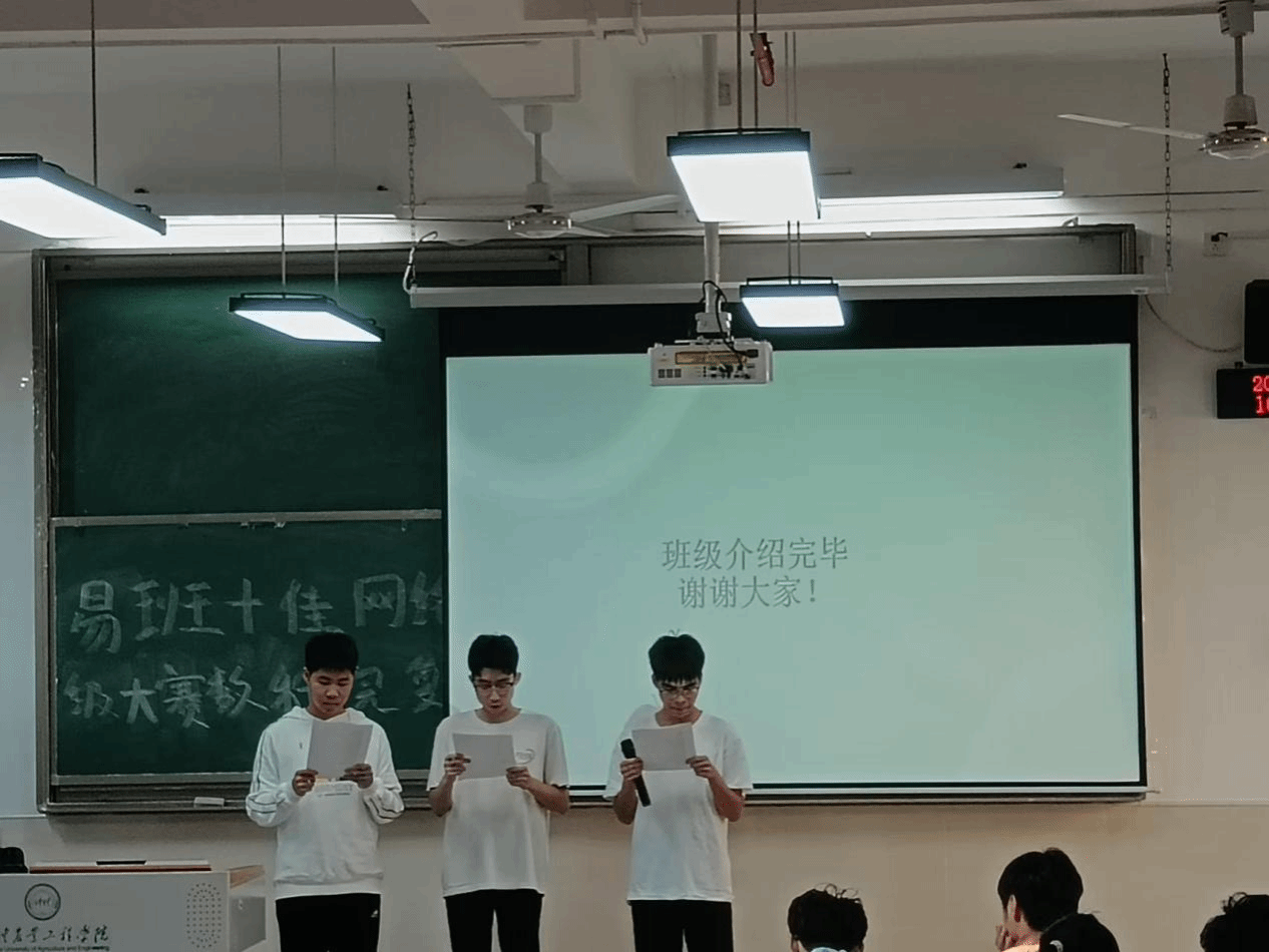 本次大赛有三个班级参与角逐,每个班级代表依次上台,对班级概况、班徽寓意以及易班班级建设成果等方面进行陈述。各班进行朗诵表演,进一步展示班级成员风采,展示各班级的蓬勃朝气、团结互助以及共同进步的良好精神风貌。评委们根据各班展示内容和表现进行评分,获得最高分的班级晋级校级比赛。