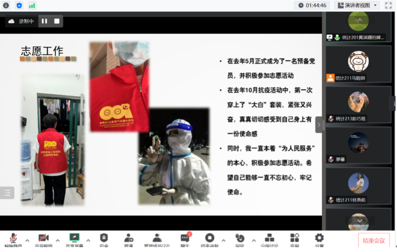 会议伊始,吕依驰简单介绍了本次答辩的流程与评定标准。候选人按照顺序依次进行答辩。候选人从自我介绍、科研经历、社会实践、获得奖项、学生工作以及志愿活动等多方面展现自己的核心竞争力,展现出我院学子踔厉奋发、笃行不怠的良好精神面貌。