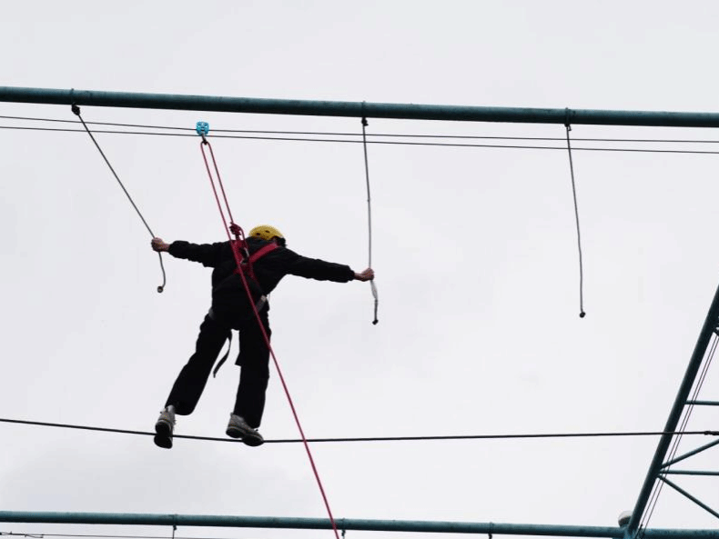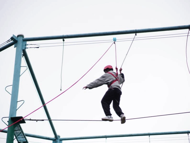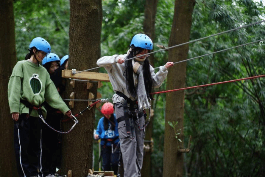 继续进行下一个挑战:高空挑战。这个活动更具有挑战性,需要同学们依次攀上8米高的架上,从圆木一端走到圆木另一端。一条悬空又狭窄的道路,想要突破,就要拿出全部的勇气。有了前面活动的铺垫,大家并没有退缩,而是选择继续接受挑战。