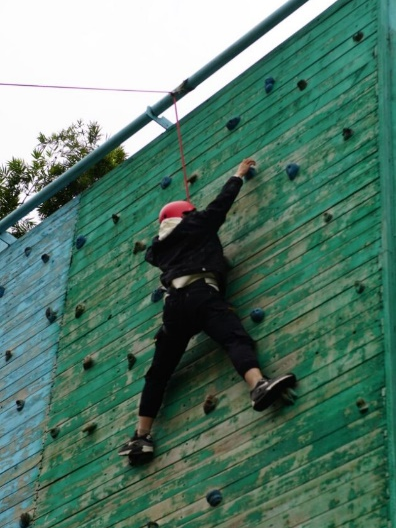 准备充分后开始第一个活动:攀岩。它是利用攀岩墙的各个支撑点,一步步攀爬到最高处。在真正活动前我们需要充分了解安全事项比如安全带的佩戴方式,听完主持人的讲解后,同学们都迫不及待地想尝试一下。