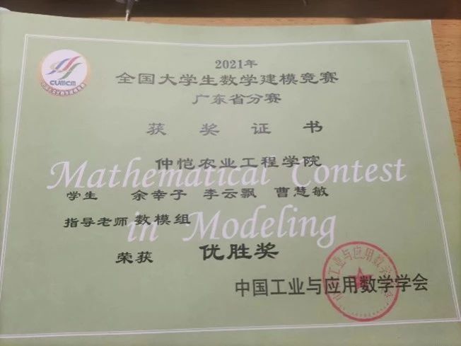 1.2021年获得全国大学生数学建模竞赛广东省分赛优胜奖;