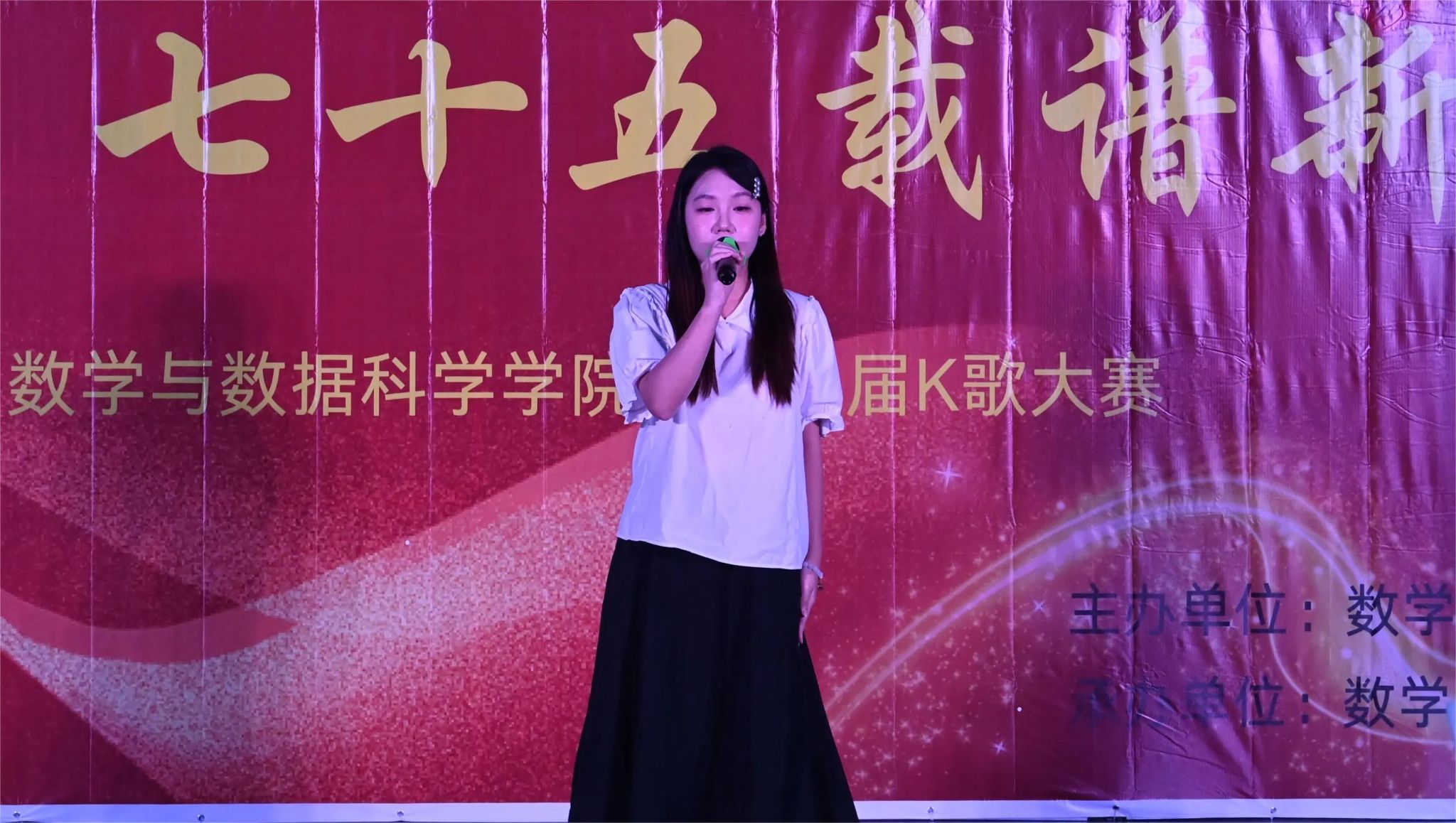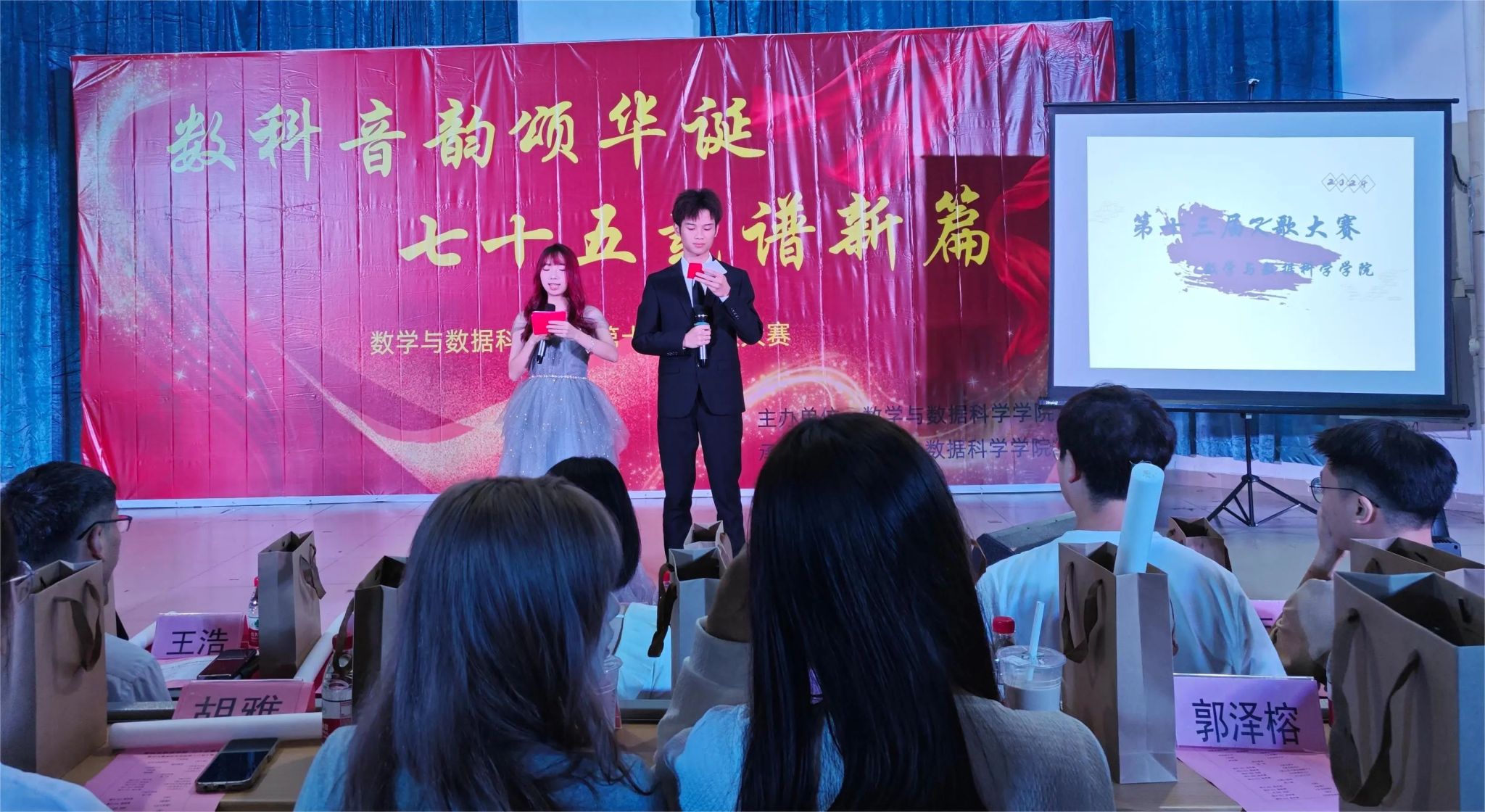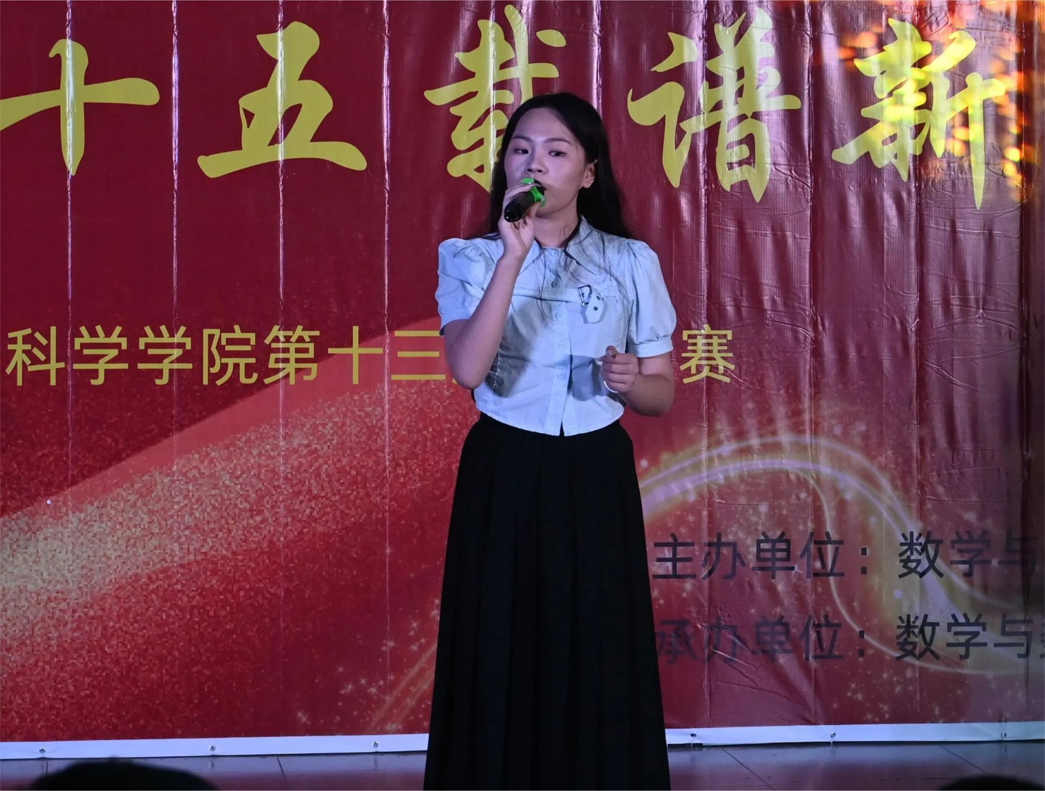 赛前,校艺术团舞蹈队为现场带来了一曲《青山献》的精彩舞蹈表演,为整个赛事拉开了精彩的序幕。大赛分为两个赛道,教师赛道和学生赛道。学生赛道由两个阶段组成,两个阶段之间,安排了一个“听歌识曲”的小游戏环节,活跃现场气氛。经两轮比赛,决出学生组的总冠军。