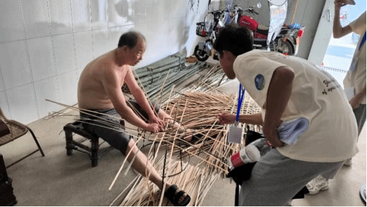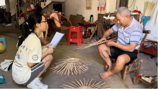 队员前往光明村采访竹编艺人,近距离学习竹编制品的制作过程,了解竹林经济的实际运作情况及现实境遇。黄金镇盛产竹子,竹林面积约10万亩,素有“竹乡”之称。2007年被评为梅州市“竹具专业镇”。上世纪80年代曾建立竹器工艺编织厂,但随着时代变迁成本低廉塑料用具逐渐占据了竹制品的市场。这些家庭作坊的老艺人大多年过六旬,他们从小学习技艺,多是制成竹篮或者鸡笼。竹编制品是挑选了绿竹制作的,正式编竹制品之前对竹子预处理的过程也是非常繁琐:先砍竹子,再刮青、弄平,然后打散成篾片,最后过削片,每寸竹片大约可以打成四片篾片,每片篾片再过削切成两片,每一步骤都需要细致耐心。这些半成品会被销往潮汕地区的工厂进行加工,最终进入市场。