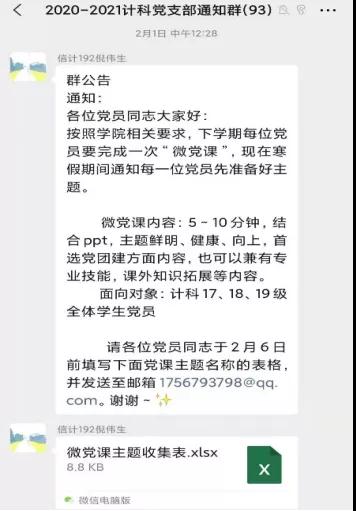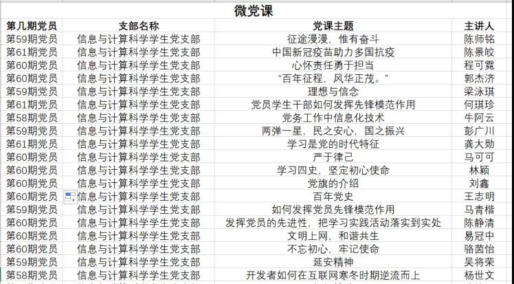 计算科学学院学生党支部在2021年上半年组织各学生党员准备微党课,结合党史,用“计科青年微党课”感悟革命历史、传承红色基因。通过沉浸式的学习方式,将党史学习教育与专业课程相结合,把党史学习教育变得立体而生动,将自身所学知识融入到课堂当中来,带领更多的计科青年一起学习。