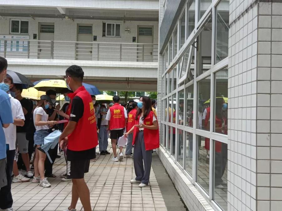 6月5日早上11时,学生党支部志愿服务队集结完毕,做好现场排队指引工作。志愿者身穿红马甲,手举各班指引牌,维护现场秩序。在学院学工老师和志愿者的指引下,全院学生在11时30分按年级、班级有序地集合完毕。