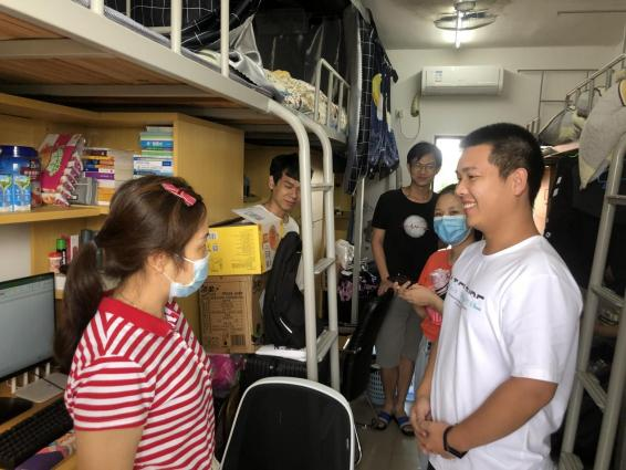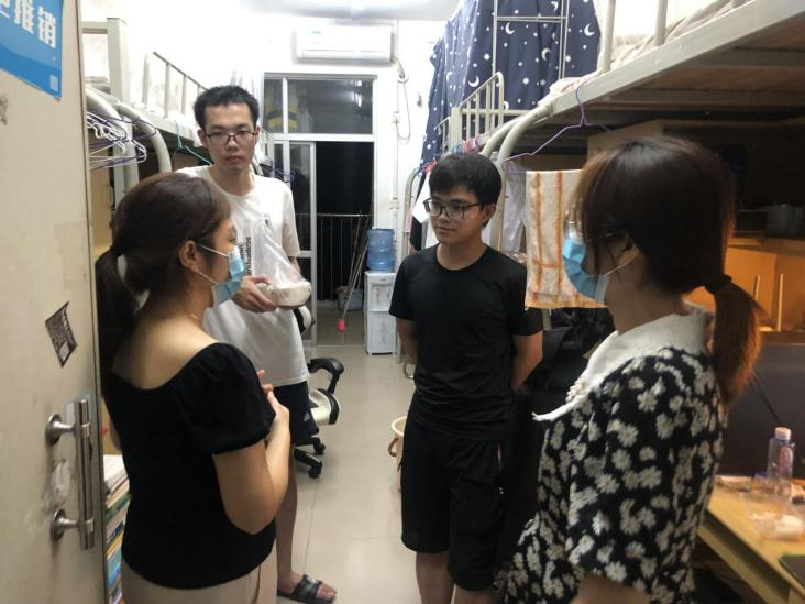 在严格遵循学校疫情防控各项措施同时,6月23至26日期间,计算科学学院党委书记刘伟坚、党委副书记郭肖明以及辅导员张素雅、廖蕃、吕依驰多次深入走访学生社区,实时了解学生的生活状况、思想动态,以及开展防诈骗和宿舍用电等安全教育引导。